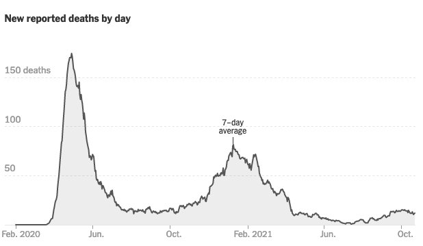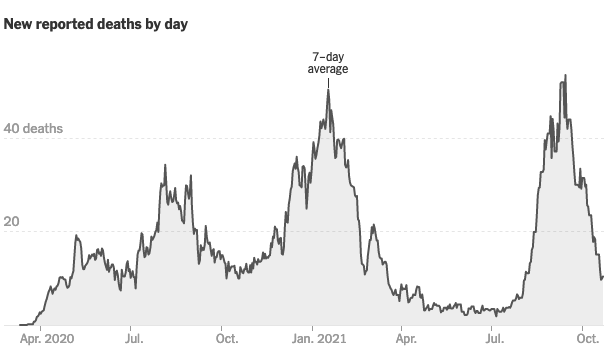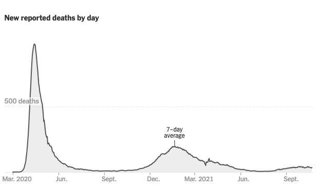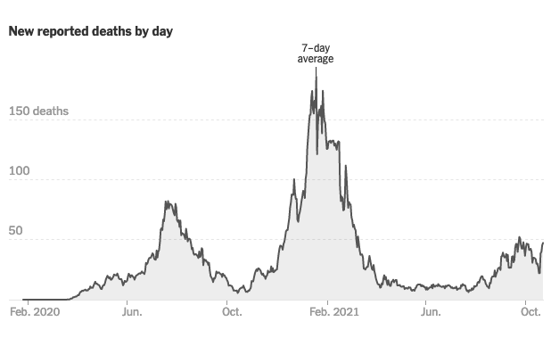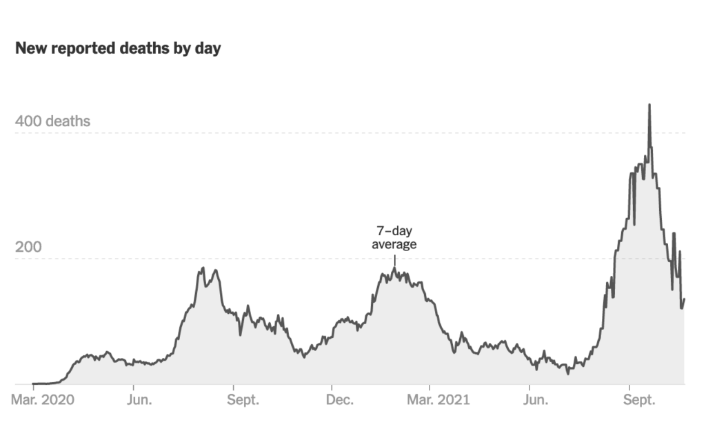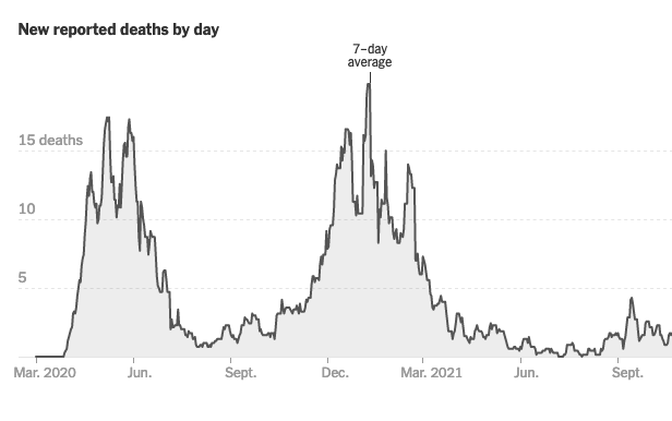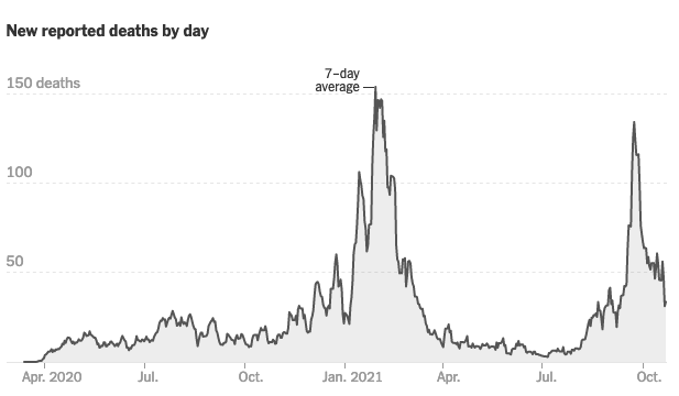 The easiest way to look at this issue in a blog post is visually. So here are the same top ten stated based on deaths per 100,000 with the NYT‘s graphs of daily deaths over time. I would argue that early surges (in the winter of 2020) are different than surges from spring 2021 onward, since any deaths in the vaccination era are far, far more preventable than those prior to vaccinations. In other words, surges in March of 2020 are the result of some combination of ignorance and lack of public health measures. Surges after May of 2021 are in the vaccination era and are simply not the same as early surges, as those surges were preventable via vaccines and mitigation policies like masking. I will leave aside too much discussion of surges in the middle spaces but would hypothesize that they are likely explainable by public variations (such as when lockdown and mask mandates were ended or not).