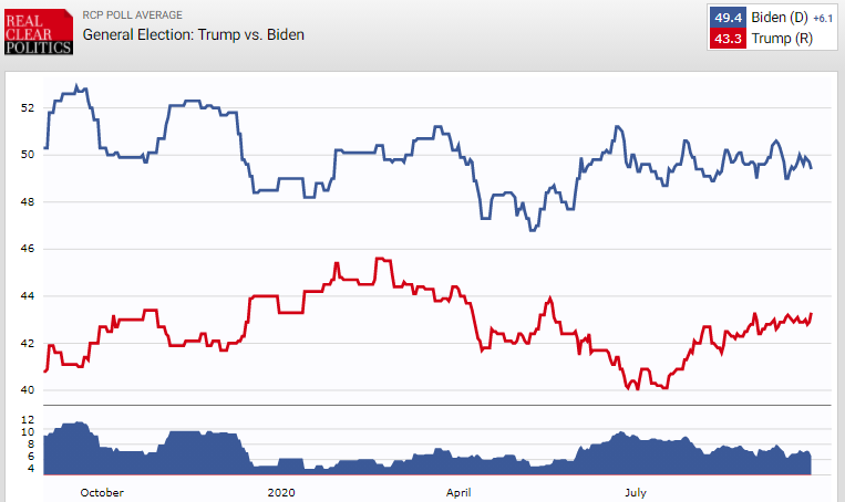 The numbers have fluctuated with events but the trend is clear: Biden has had a significant lead from the beginning and never given it up. He’s 6.1 points up as of a couple days ago.
