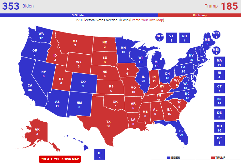 Even if he runs the table—which is unlikely—353 electors is fewer than Barack Obama won in 2008 or Bill Clinton won in either 1992 or 1996. But still a pretty solid margin in a hyper-polarized political culture.