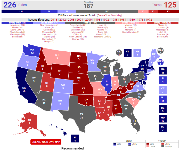 As noted many times, that Texas and Georgia are “toss-ups” is a horrible sign for Trump’s re-election chances. And Biden only needs to pick up 44 electors to get to the magical 270 majority; there are an inordinate number of ways for him to do that. Trump needs 145 of 187—essentially an inside straight.