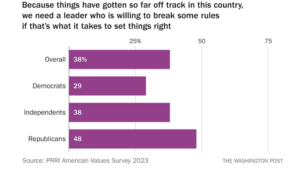 - To that point, Philip Bump (again, WaPo) notes that A lot of Americans embrace Trump’s authoritarianism. I hate to say it but a lot of the survey data in that piece reminds me of things I saw studying Latin American cases of democratic breakdown. For example, a plurality of conservatives in a recent survey endorsed the idea that we need a “strong leader” and then there are things like this: