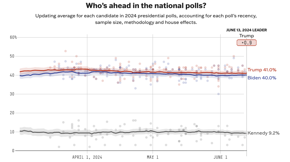 Two weeks after former President Donald Trump was convicted on 34 felony counts, with constant reporting of his increasing incoherence, one might think he would be dropping in the polls and becoming less likely to get re-elected. Yet, the race remains remarkably stable.