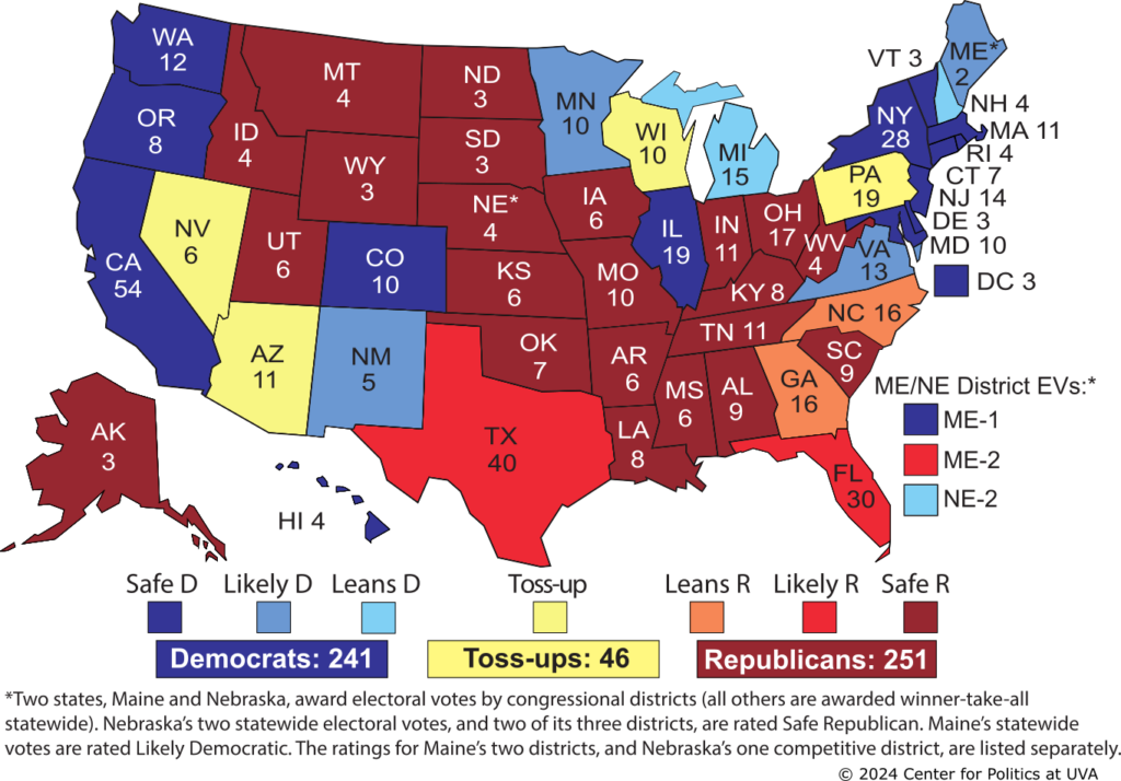 Georgia, by margin the Democrats’ narrowest presidential victory in 2020 (although Arizona’s margin was only very slightly higher), goes from Toss-up to Leans Republican. This nudges the GOP total to 251 votes at least leaning to them, 19 short of the magic number of 270. One could argue that all three of Arizona, Nevada, and Georgia could or should be Leans Republican. We think that’s premature, particularly Nevada, where polls often overstate Republicans and Democrats have a proven ground game operation. It’s splitting hairs to some degree, but Georgia was probably the most surprising of Biden’s 2020 victories, and it may be a little bit more Republican at its core than the other two are: Democrats hold all of the Senate seats from these three states, but Democrats were shut out in statewide executive office elections in both 2018 and 2022 in Georgia, which was not the case in Arizona and Nevada. There also has been publicly reported pessimism from Democrats about Georgia for many months. Georgia is the only one of the seven states decided by 3 points or less in 2020 that does not have a high-profile Senate or gubernatorial election this year: Arizona, Michigan, Nevada, Pennsylvania, and Wisconsin have Senate elections and North Carolina has a gubernatorial race. There has been some suggestion that this could hurt Democratic turnout in Georgia, but that is not really factoring into our thinking: Presidential races, to us, are what drive turnout. Let’s remember that “Leans” does not mean “Safe.” Georgia still remains one of the key swing states even as we see a little bit of a GOP edge there for November.