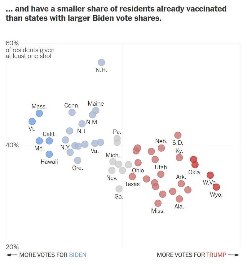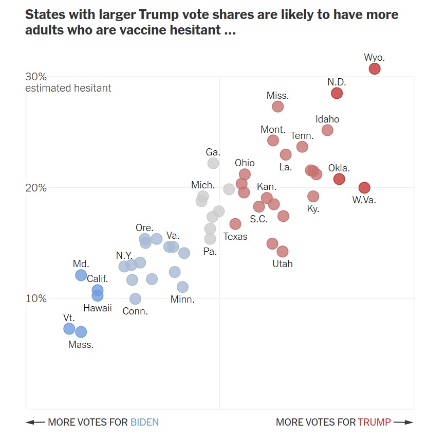 While the two state-level charts shown here are sufficient to make the point about correlation, the original article at the NYT site has county-by-county plots for every state if you scroll down about halfway. The trend within individual states is not nearly as clear, though you would expect it to be a stronger effect. In fact, only a few states (California, Colorado) show a similar pattern internally. In some deep red states like Kansas, the few Biden-voting counties are not the most vaccinated. To me, that suggests that there is something else going on. I’d love to see urban-vs-rural and age-based splits for comparison.