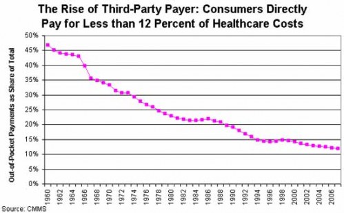 When consumers are insulated from the cost of a good or service, they aren’t going to take the price of that good or service into account when deciding whether or not to purchase it, which means that the normal supply-demand price mechanism isn’t going to work. In the long run, this means prices will go up. Of course, it’s true that health care itself is a good that isn’t necessarily subject to the same market prices as, say, groceries. We all want to live forever, and when we’re sick we want to feel better. Nonetheless, when someone else is paying the bill and, as the chart above shows right now someone else (the government and private insurance) is paying 88% of the bill on average, consumers have every incentive to use as much health care as they can.